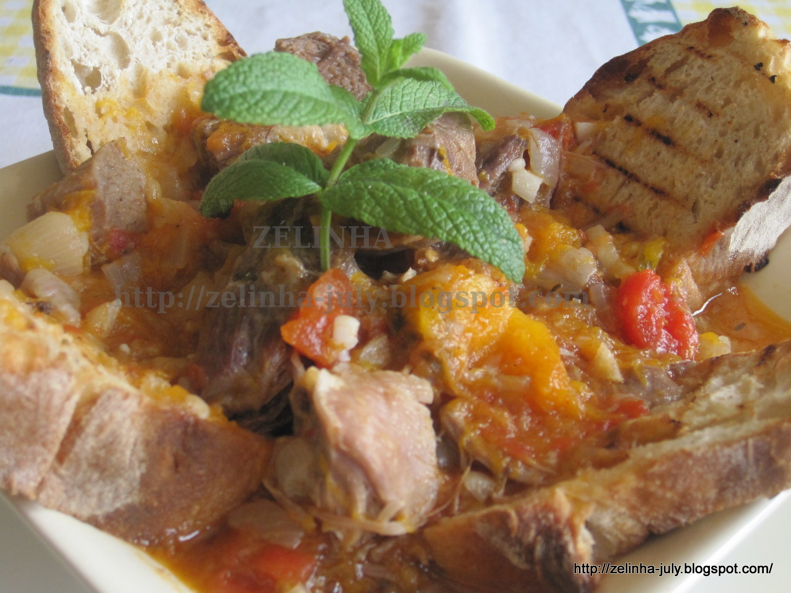 6. Sirva o ensopado sobre o pão em fatias torradas.