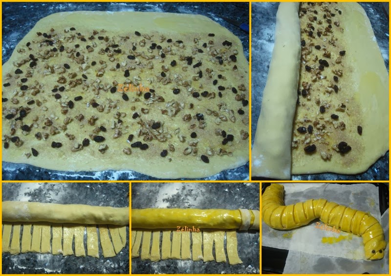 - Pincele com a manteiga derretida, espalhe por cima o açúcar mascavado, as passas de uva e o miolo das nozes, deixando uma borda sem recheio, que irá ser utilizada para fazer os anéis da lagarticha;