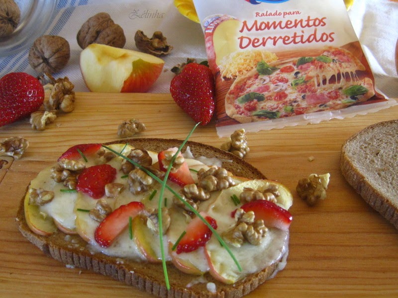- Retirei, espalhamos morangos laminados, miolo de nozes e cebolinho;