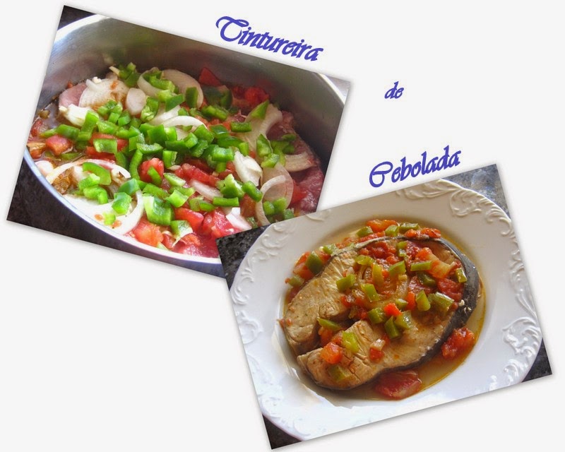 1. No fundo de um tacho coloque uma cebola cortada em rodela, adicione 1 tomate pelado cortado em pequenos pedaços;