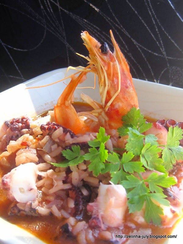 4. Adicione o arroz, o polvo cortado em pequenos pedaços, o camarão e a água do polvo a ferver, envolva e deixe cozer cozer em lume brando durante 12 minutos;