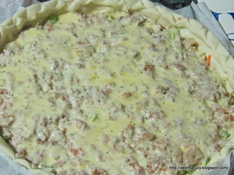 1. Estenda a massa folhada na tarteira, com o papel vegetal, reserve;